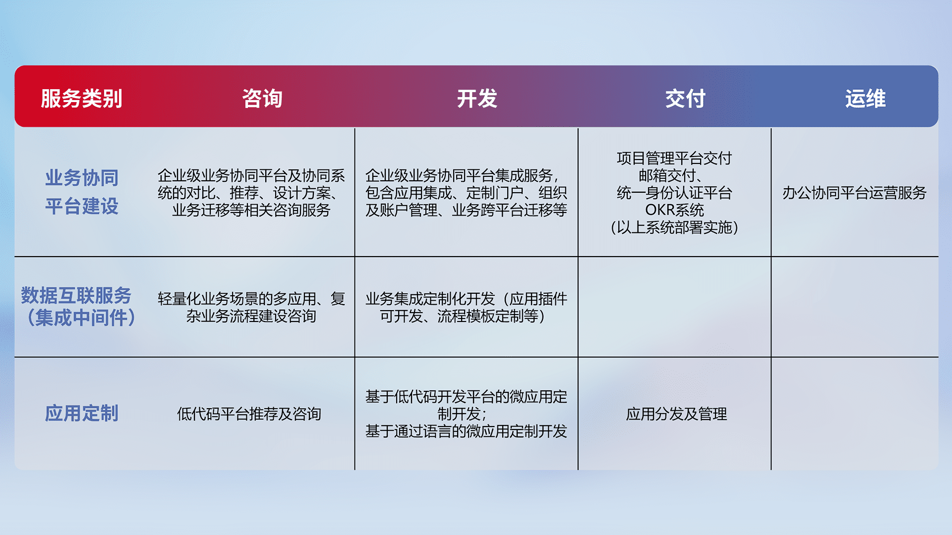 针对钉钉、、、企微、、、、IDaas等平台级产品提供产品的规划、、、方案、、、交付、、、、定制化开发等服务,,实现如统一协同办公、、、、智能客户服务、、、混合会议管理、、智能数据查询、、、、等业务场景,,,实现数字化转型。。。。