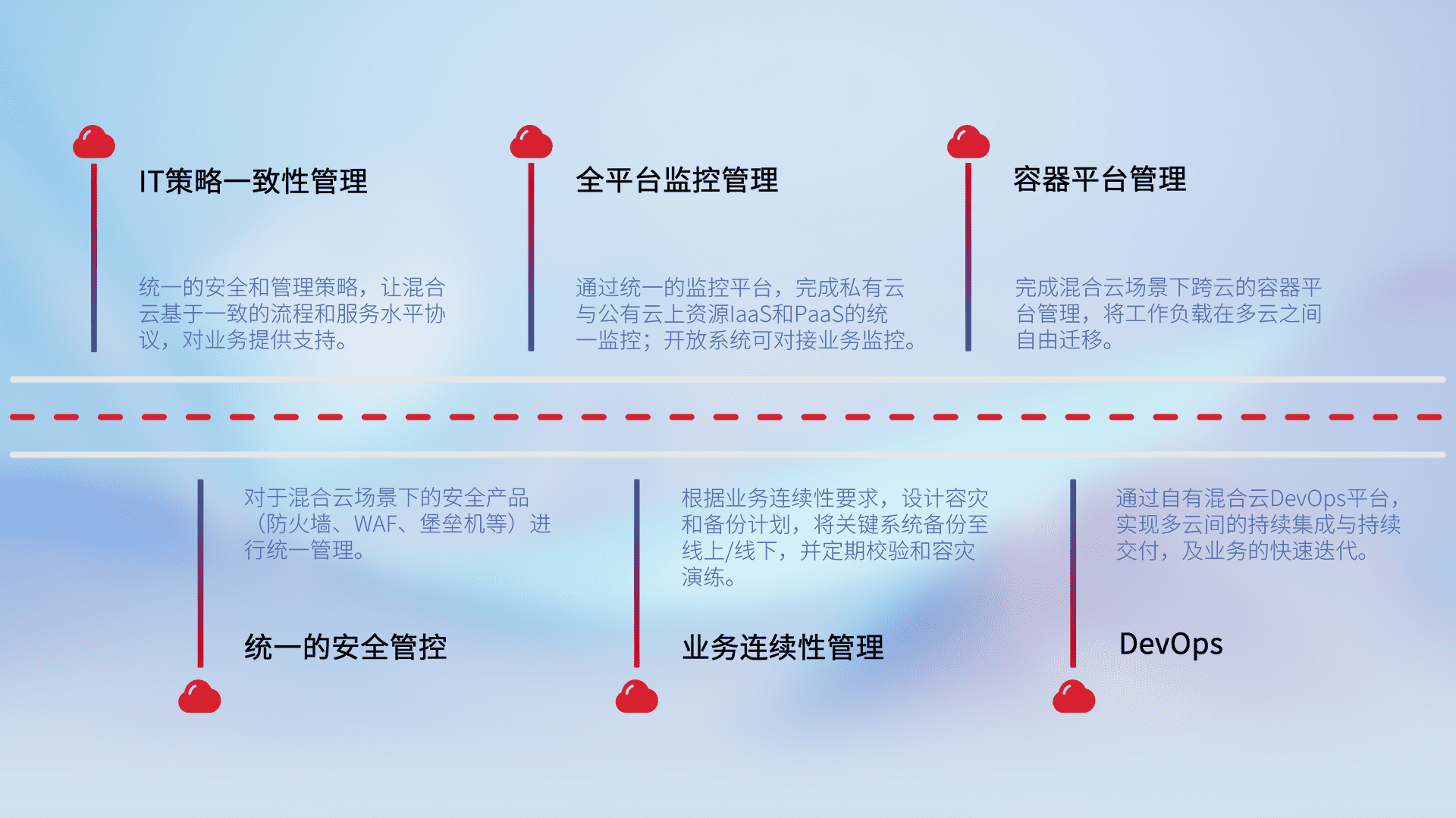通过多云纳管,,以统一的资源数据模型把客户的云资源进行抽象和封装,,进而实现对多云资源的统一操作,,保障云资源管理的可靠性、、、稳定性与可用性。。。量身定制化运维内容,,,,配置、、开发运维、、、、补丁管理、、备份、、监控、、、认证和访问管理、、、、审计和日常巡检等,,,,保障在用云过程中的可靠度,,,,稳定度以及高可用率。。